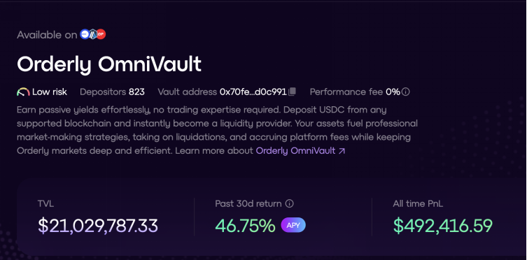 Orderly 于 2025 年 4 月推出 OmniVault,使 DeFi 用户能够成为流动性提供者(LP),通过被动方式赚取收益。OmniVault 采用由可信机构管理的做市策略,使 LP 可以存入 USDC,并在 Orderly 支持的多个网络上获得收益。