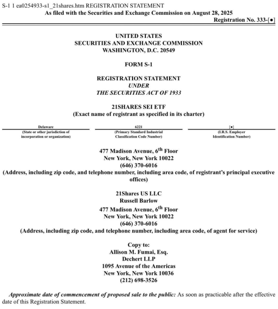 21Shares 向 SEC 递交申请,拟推出 $SEI ETF