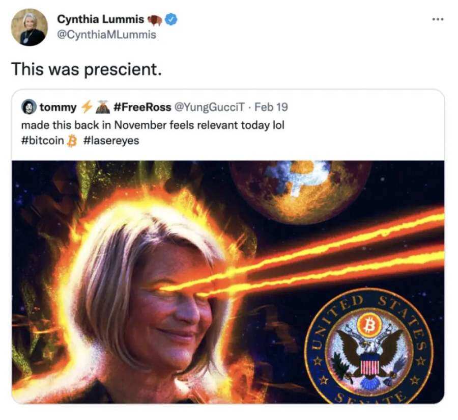 最典型的就是那些「激光眼」头像,个人简介里可能就一个词:Bitcoin。