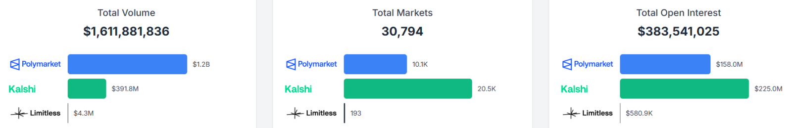 Polymarketanalytics 最新数据显示,其总的交易者为 1349740 个,预测市场数量为 46995 个。虽然 Polymarket 在总交易额上遥遥领先领先,不过在总市场以及总未平仓头寸上却落后于 Kalshi。