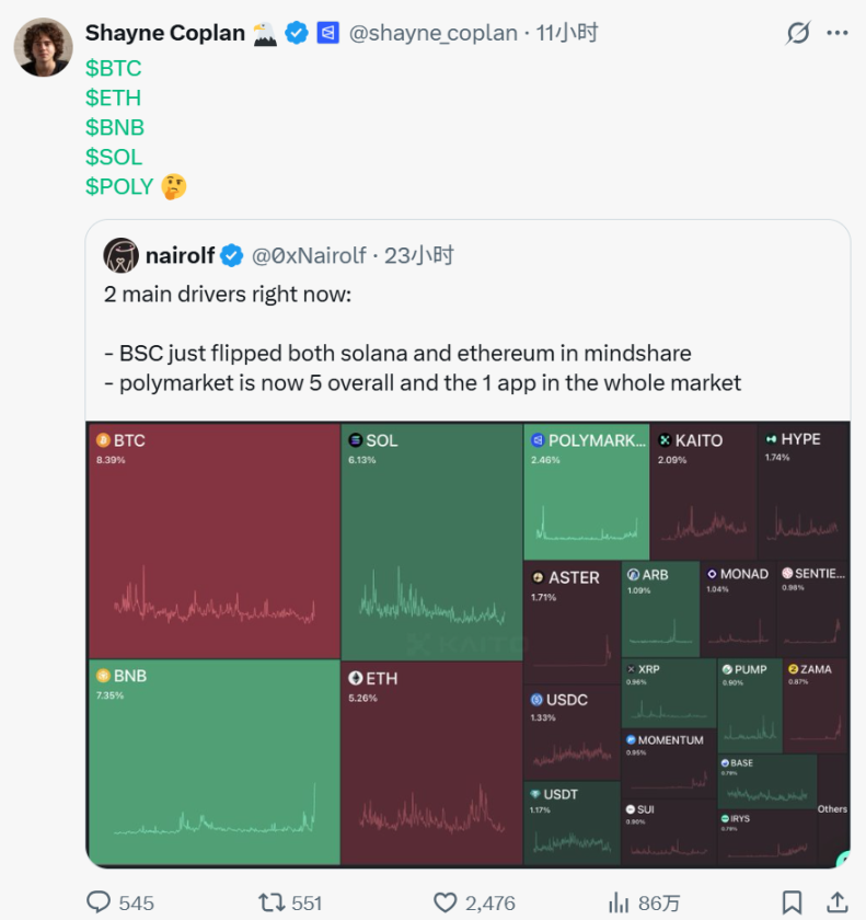 10 月 8 日,Polymarket 创始人 Shayne Coplan 在转发推文时将 POLY 的代币符号排在 BTC、ETH、BNB 以及 SOL 之后,暗示 Polymarket 的代币名称或为 POLY。不过发币时间仍不得而知。